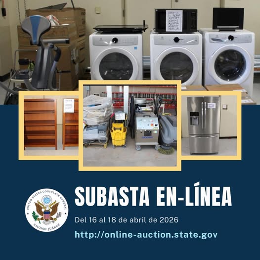 El Consulado General de los Estados Unidos en Ciudad Juárez subastará en línea un lote de bienes muebles excedentes a partir de mañana y hasta el sábado 18 de abril.