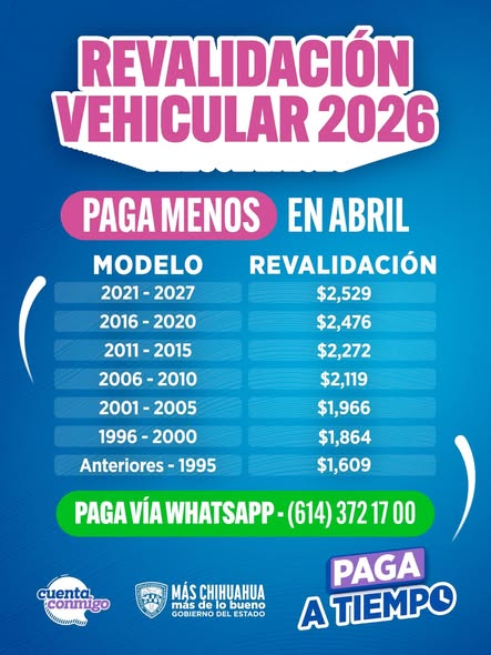 La revalidación vehicular se puede pagar en las oficinas de Recaudación de Rentas, de lunes a viernes de 8:00 a 16:00 horas, en las ciudades de Chihuahua y Juárez. En el resto del estado, la atención es de 9:00 a 15:00 horas.