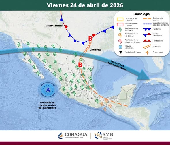 - Viento de 20 a 30 km/h con rachas de 40 a 60 km/h y posibles tolvaneras: Baja California, Sonora, Chihuahua y Durango.