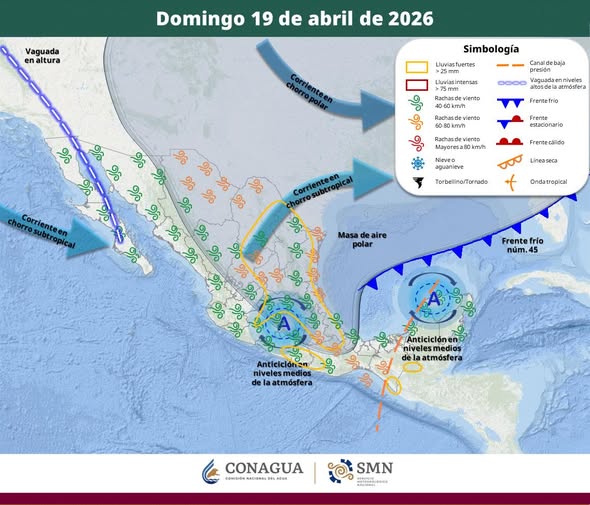 El frente frío núm. 45 se desplazará sobre el noreste del territorio mexicano y el litoral del golfo de México, interaccionará con un canal de baja presión extendido sobre el sureste del país, propiciando lluvias puntuales muy fuertes en Tamaulipas, Hidalgo, Oaxaca, Puebla y Veracruz; lluvias fuertes en Coahuila, Nuevo León, San Luis Potosí, Querétaro, Tlaxcala, Oaxaca y Chiapas; chubascos en Estado de México, Ciudad de México, Morelos y Tabasco; así como lluvias aisladas en Campeche, Yucatán y Quintana Roo.