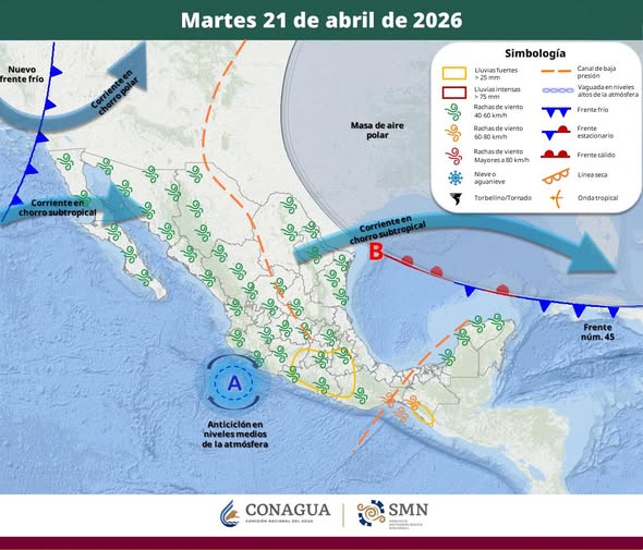 - Viento de 20 a 30 km/h con rachas de 40 a 60 km/h y posibles tolvaneras: Baja California, Sonora, Chihuahua, Durango y Zacatecas.