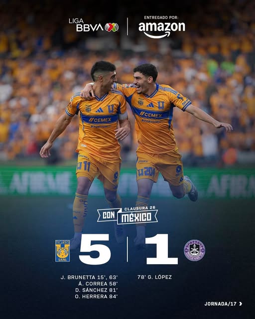Tigres cerró la fase regular con autoridad tras imponerse 5-1 a Mazatlán en la Jornada 17, en un duelo que marcó la despedida del conjunto sinaloense de la Liga MX.