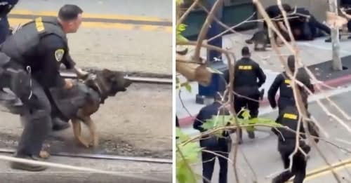 Con una destreza sorprendente el animal mordió la manga del sujeto y lo jaló hacia el piso. Con esa acción logró derribarlo y mantenerlo neutralizado unos segundos hasta que los policías estuvieron lo suficientemente cerca para concretar el arresto.