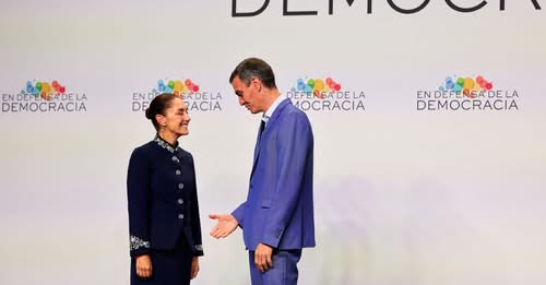 Tras la IV Cumbre en Defensa de la Democracia, la mandataria se reunió durante una hora con el presidente del gobierno español; también hablaron sobre de la situación global y de las relaciones de la Unión Europea y México