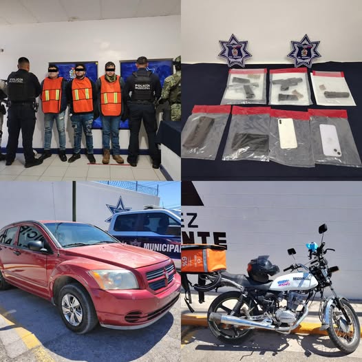 La intervención se dio luego de que los elementos atendieron un llamado al número comunitario del Distrito Oriente 656-597-42-13, en donde reportaron tres masculinos armados, uno de ellos a bordo de una motocicleta de la marca Honda color blanco con una mochila de repartidor de comida rápida y dos más en un vehículo de la marca Dodge Caliber, color guinda, en el cruce de las calles Solar de Claveles y Valle del Sol, en el fraccionamiento Villa Solares.